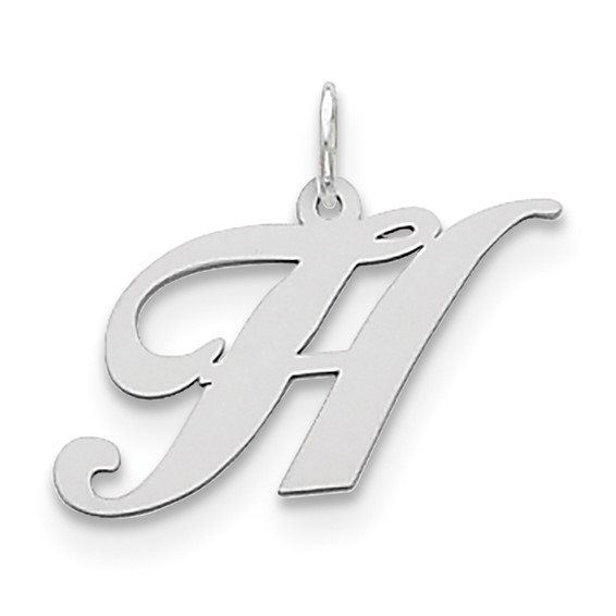 This medium fancy script initial H charm is made of polished sterling silver. Measures 1/2 inch tall without bail. Weight: 0.56 grams.