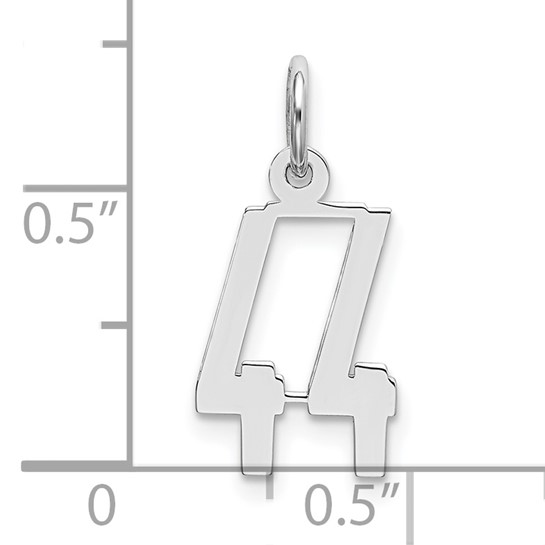 This small elongated number 44 pendant is made of solid polished sterling silver. Weight: 0.72 grams. Number measures 1/2 inch tall without bail.
