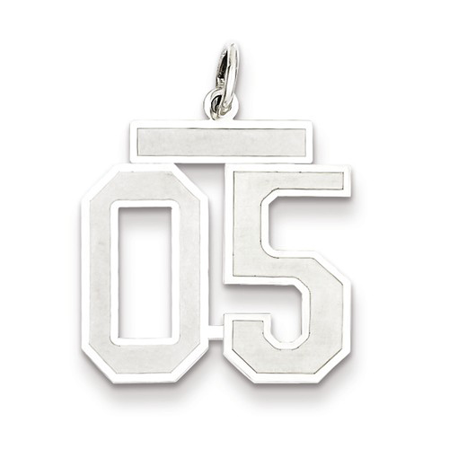 Medium number 05 charm with top bar is made of sterling silver with a satin finish. Weight: 0.93 grams. Number measures 5/8 inch tall without bail. Made in the USA.