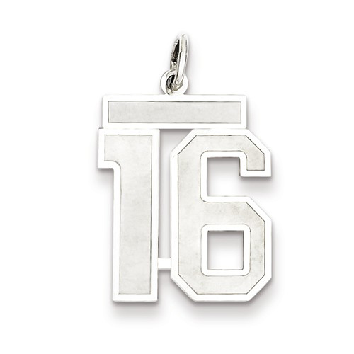 Sterling silver medium number 16 charm has a satin finish. Number measures 5/8 inch tall without bail. Weight: 0.93 grams. Fits up to a 3mm wide chain. Made in USA.