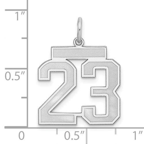 Sterling silver number 23 pendant has a satin and polished finish. Pendant measures 5/8 inch tall without jump ring. Fits up to a 3mm wide chain. Rhodium-plated. Approximate weight: 1.0 gram. Made in USA.