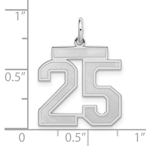 Sterling silver number 25 pendant has a satin and polished finish. Pendant measures 5/8 inch tall without jump ring. Fits up to a 3mm wide chain. Rhodium-plated. Approximate weight: 1.0 gram. Made in USA.