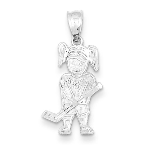 Hockey girl charm is made of sterling silver. Measures 3/4 inch tall by 1/2 inch wide without bail. Weight: 0.68 grams.
