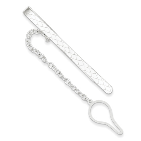 Sterling silver textured tie bar has a chain. Item size: 2 1/4 inches tall by 3/16 inch wide. Weight: 5 grams. Made in Italy.