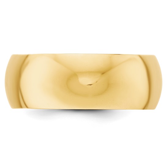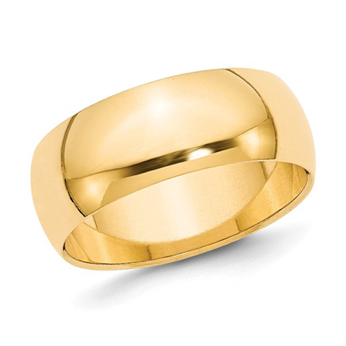 This solid 10k yellow gold wedding band has a slightly domed center and polished finish. Width: 8.0mm, thickness 1.4mm. Standard fit. Size 5 weighs 5.5 grams, size 10 weighs 7.1 grams. Made in the USA.