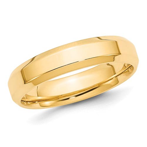 This wedding band is composed of polished, solid 14k yellow gold. Width: 5mm. Beveled edges, comfort fit. Size 5 ring weighs 5.6 grams, size 10 ring weighs 7.0 grams. Made in the USA. Engraving available upon request.