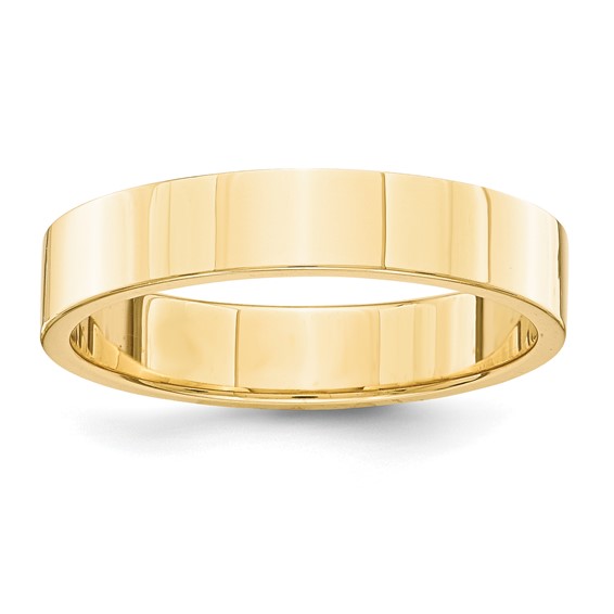 Solid 14k yellow gold wedding band has a polished finish and flat center. Width: 4mm. Standard fit. Thickness: 1.2mm. A size 7 band weighs approximately 3.59 grams. Made in the USA.