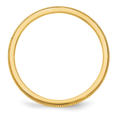 Slender milgrain wedding band is made of solid 14k yellow gold. Width: 1.5mm. Size 7 band weighs 1.5 grams. Polished finish and flat edges. Standard fit. Made in the USA.