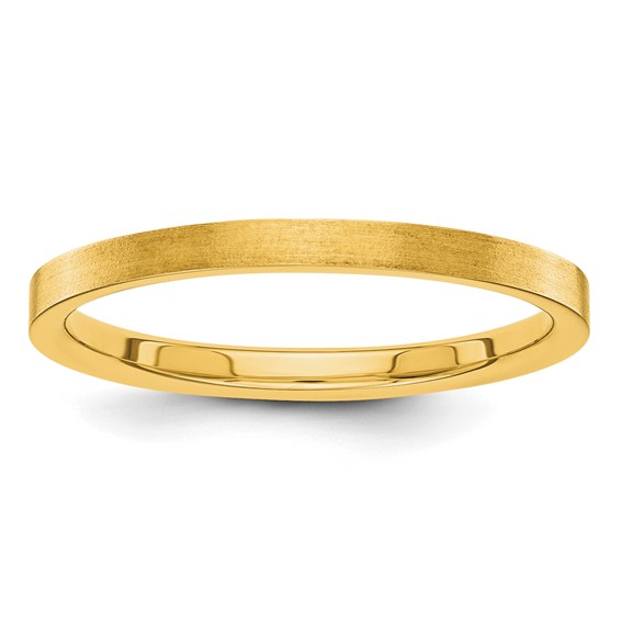 2mm flat wedding band with satin finish is made of 14kt yellow gold. Size 7 weight: 2.19 grams. Flat edges. Made in USA.