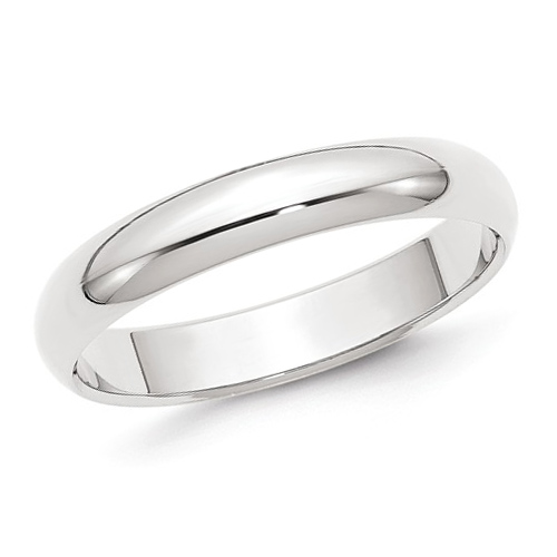 14kt white gold 4mm wedding band has a domed center and polished finish. Die struck. Standard fit. Thickness: 1.4mm. Available in half and whole finger sizes only, 4-12. Size 7 band weighs approximately 3.7 grams. Made in the USA.