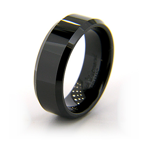 Solid black ceramic ring. Flat with 45 degree angled edges. High polished mirror finish. Ring measures 8mm wide, approx 5/16 inch wide. Thickness: 2.5mm. Made in USA. Comfort fit. Our customers may exchange this ring as many times as needed for the lifetime of the ring for a different size. Return shipping fees apply.