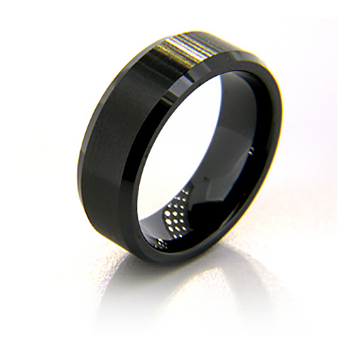 Solid black ceramic ring. Flat with 45 degree angled edges. High polished mirror finish inside. Satin finish outside. Ring measures 8mm wide, approx 5/16 inch wide. Thickness: 2.5mm. Made in USA. Comfort fit. Our customers may exchange this ring as many times as needed for the lifetime of the ring for a different size. Return shipping fees apply.
