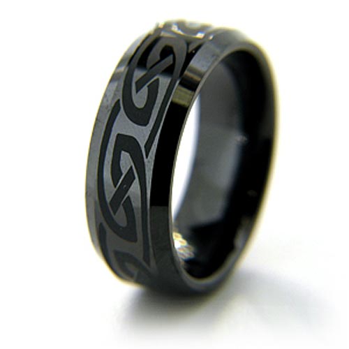 Solid black ceramic ring. Flat with 45 degree angled edges. High polished mirror finish. Intertwining knot design etched in surface. Ring measures 8mm wide, approx 5/16 inch wide. Thickness: 2.5mm. Made in USA. Comfort fit. Our customers may exchange this ring as many times as needed for the lifetime of the ring for a different size. Return shipping fees apply.