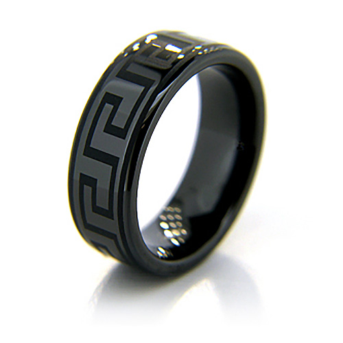 Solid black ceramic ring. Flat with very slightly rounded edges. High polished mirror finish. Greek design etched in surface. Ring measures 8mm wide, approx 5/16 inch wide. Made in USA. Comfort fit. Our customers may exchange this ring as many times as needed for the lifetime of the ring for a different size. Return shipping fees apply.