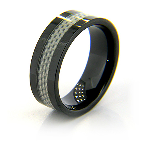 Solid black ceramic ring. Flat ring with carbon fiber inlay. High polished mirror finish. Ring measures 8mm wide, approx 5/16 inch wide. Made in USA. Comfort fit. Our customers may exchange this ring as many times as needed for the lifetime of the ring for a different size. Return shipping fees apply.