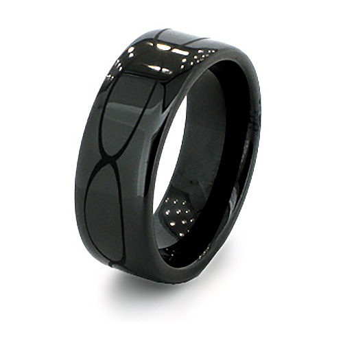 Solid black ceramic ring has an oval design etched in surface. Flat center. High polished mirror finish. Ring measures 8mm wide, approx 5/16 inch wide. Made in USA. Comfort fit. Our customers may exchange this ring as many times as needed for the lifetime of the ring for a different size. Return shipping fees apply.