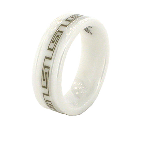 White ceramic 7mm ring has a laser engraved Greek key design and rounded edges. High polished mirror finish. Comfort fit. Made in USA. Our customers may exchange this ring as many times as needed for the lifetime of the ring for a different size. Return shipping fees apply.