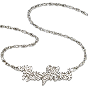 Show your US Navy pride with this Navy Mom necklace made in sterling silver with detailed metal molding. Comes with an 18 inch chain and fancy lobster clasp. Hand finished to a high polish.