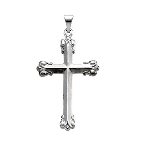 This large budded cross is made of polished sterling silver. Item size: 37.5mm x 23.5mm. Fits up to a 3mm wide chain. Weight: 3.32 grams.