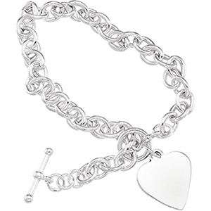 Cable bracelet with heart is made of polished sterling silver. Engravable heart. Engrave up to 6 letters and spaces. Bracelet length: 8in. Link width: 5.75mm. Weight: 15.00 grams.