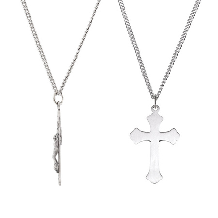 This jumbo sterling silver budded crucifix has an antique finish. Dimensions: 46mm x 30mm. 24in sterling silver curb chain included. Weight: 11.94 grams.