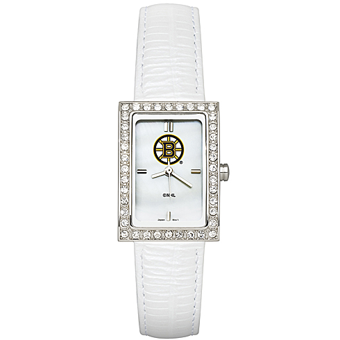 This women's fashion watch has a mother of pearl dial with team color logo and raised hour markers. Features polished chrome finish alloy case with cubic zirconium crystals and stainless steel back. Comes with padded white leather strap. Contains Miyota quartz movement and comes packaged in a pillow black clamshell gift box. Limited lifetime warranty.