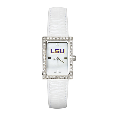 The LSU allure watch has a mother of pearl dial with team color logo and raised hour markers. Comes with padded white leather strap. Polished chrome finish alloy case with cubic zirconium crystals and stainless steel back. Miyota quartz movement. Pillow black clamshell gift box. Limited lifetime warranty.