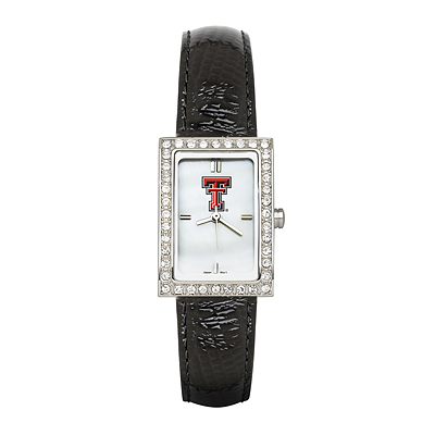 This women's Texas Tech University allure watch has a mother of pearl dial with school logo and raised hour markers. Comes with padded black leather strap. Features polished chrome finish alloy case with cubic zirconium crystals and stainless steel back. Miyota quartz movement and comes packaged in a pillow black clamshell gift box. Limited lifetime warranty.