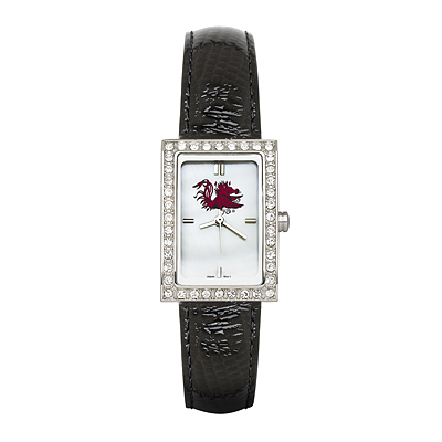 The University of South Carolina ladies' allure watch has a mother of pearl dial with school mascot logo and raised hour markers. Padded black leather strap. Polished chrome finish alloy case with cubic zirconium crystals and stainless steel back. Miyota quartz movement. Pillow black clamshell gift box. Limited lifetime warranty.