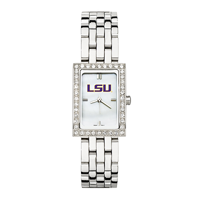 The ladies' Louisiana State University Allure watch has a mother of pearl dial with team color logo and raised hour markers. Features polished chrome finish alloy case with cubic zirconium crystals and stainless steel back. Comes with stainless steel bracelet strap. Contains Miyota® quartz movement and comes packaged in a pillow black clamshell gift box. Limited lifetime warranty.
