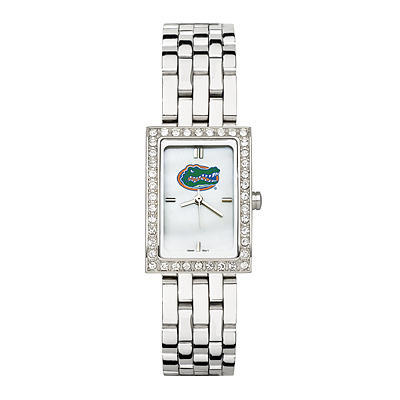 The Florida Gators Allure watch for women has a mother of pearl dial with team color logo and raised hour markers. Features polished chrome finish alloy case with cubic zirconium crystals and stainless steel back. Comes with stainless steel bracelet strap. Contains Miyota quartz movement and comes packaged in a pillow black clamshell gift box. Limited lifetime warranty.