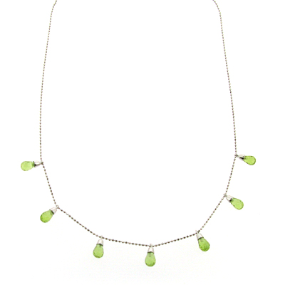 14kt white gold peridot necklace. Piece weighs 2.2 grams. Seven peridot stones are 5.8 ct total weight. Chain included.