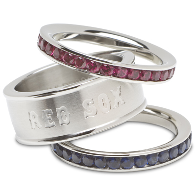 Boston Red Sox crystal team logo ring set contains stackable team colored crystal rings and a logo ring. This official product is fully licensed and made using intricate metal molds and injected patterns for amazing detail. Rings measure approximately 5/8 inch wide when stacked together. Offered in ladies sizes 6 and 8 while supplies last. Comes with leatherette pouch for protection.