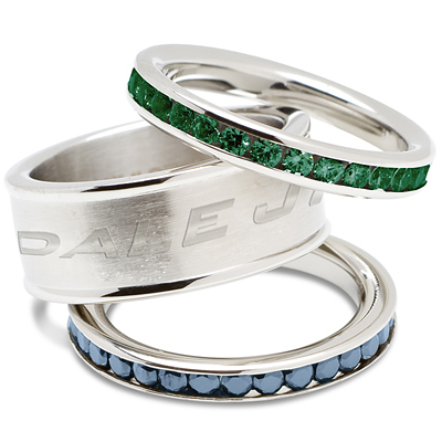 Dale Earnhardt Jr crystal team logo ring set contains stackable team colored crystal rings and a DALE JR logo ring. This official product is fully licensed and made using intricate metal molds and injected patterns for amazing detail. Rings measure approximately 5/8 inch wide when stacked together. Offered in ladies sizes 6, 7, 8 and 9. Comes with leatherette pouch for protection.
