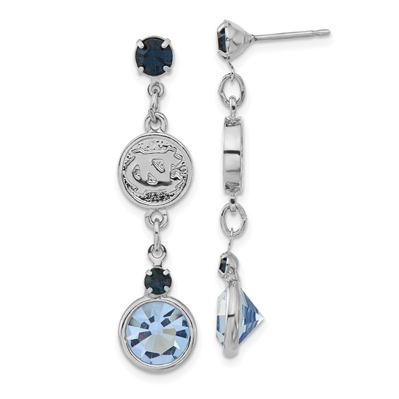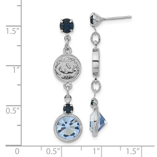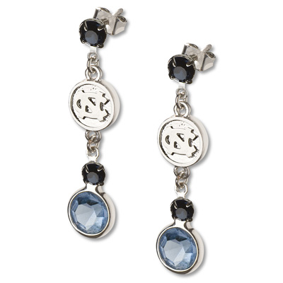 University of North Carolina crystal logo dangle earrings are made of rhodium-plated mixed metal. Earrings length: 1 1/2in. The dark blue crystals are 1/8in and the light blue crystal and the University of North Carolina logo are 5/16in in diameter. This official product is fully licensed and made using intricate metal molds and injected patterns for amazing detail.