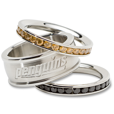 Pittsburgh Penguins crystal team logo ring set contains stackable team colored crystal rings and a logo ring. This is fully licensed and made using intricate metal molds and injected patterns for amazing detail. Rings measure approximately 5/8 inch wide when stacked together. Offered in ladies sizes 6, 7, 8 and 9. Comes with leatherette pouch for protection.