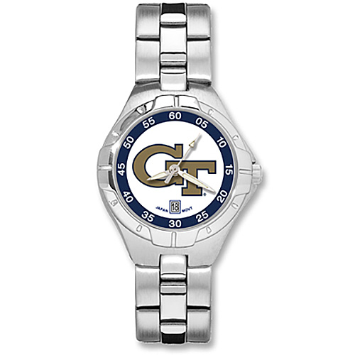 The women's Georgia Tech Pro II watch features the school logo prominently centered on the colorful dial. Brushed chrome alloy case dimensions: 1 3/8in x 1 1/8in. Dial diameter: 11/16in. Precision Miyota three hand quartz movement with date function. Stainless steel bracelet. Stainless steel caseback. Packaged in black tin box. Water resistant. Two year limited warranty.