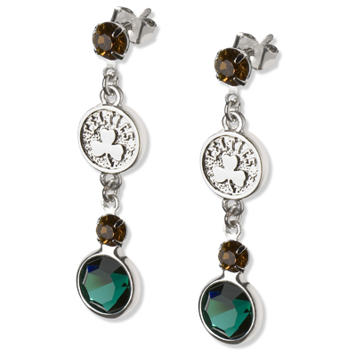 Boston Cetlics crystal team logo dangle earrings feature gold and green crystals. Earrings length: 1 1/2in. The gold crystals are 1/8in and the green crystal and the Boston Celtics logo are 5/16in in diameter. This product is fully licensed and made using intricate metal molds and injected patterns for amazing detail. Import.