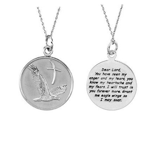 Sterling silver overcoming difficulties pendant is designed by Susan Howard. The pendant features an an eagle and cross. Item size: 20mm, slightly larger than a penny. 18in sterling silver chain. Through faith and compassion Susan Howard has poured out her heart and created Comfort Wear Jewelry. Among the collection you will find a wide selection of memorial jewelry designed to help bring comfort to grieving loved ones. Etched on the back you will find beautiful prayers specific to each piece inspired by faith.