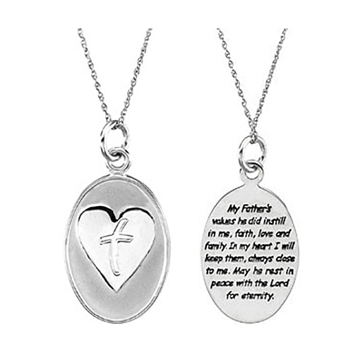 Loss of father pendant is made of polished sterling silver. Pendant size: 21mm by 15.20mm. Weight: 2.9 grams. Chain sold separately. Through faith and compassion Susan Howard has poured out her heart and created Comfort Wear Jewelry. Among the collection you will find a wide selection of memorial jewelry designed to help bring comfort to grieving loved ones. Etched on the back you will find beautiful prayers specific to each piece inspired by faith.