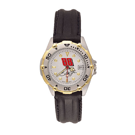 Dale Jr. all star woman's watch has a brushed chrome finish case with a rotating two-tone bezel and matching leather bracelet. The All-Star features a precision Miyota quartz movement, distinguished dial face, with the team logo on the top half and team name on lower half of dial, date window, raised luminous hour, minute and second hands, and the crystal is mineral glass. Water resistant. Packaged in an attractive silver tin. Two year limited warranty.