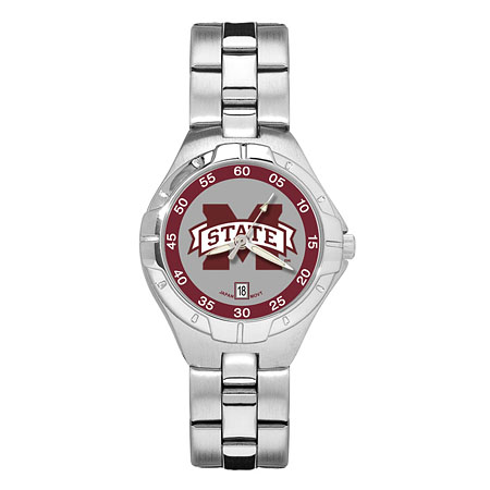 The ladies' Mississippi State Pro II watch has a brushed chrome alloy case and stainless steel bracelet. The dial features the school logo with coordinating dial ring. Powered by a precision Miyota three hand quartz movement with date function. Packaged in an attractive case with flocked insert. Water resistant. Two year limited warranty.