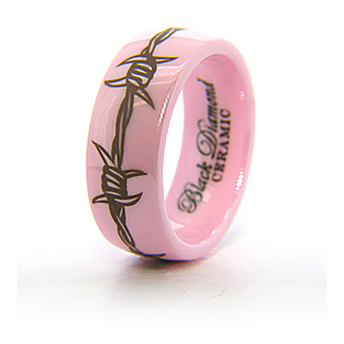 Pink ceramic 8mm ring has a barbwire design. Domed center and high polish finish. Comfort fit. Made in USA. Our customers may exchange this ring as many times as needed for the lifetime of the ring for a different size. Return shipping fees apply. Weight: approx 7 grams.