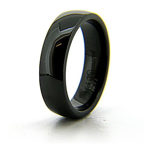 Solid black ceramic ring. Domed ring with rounded edges. High polished mirror finish. Ring measures 6mm wide. Made in USA. Comfort fit. Our customers may exchange this ring as many times as needed for the lifetime of the ring for a different size. Return shipping fees apply. Weight: approx 5 grams.