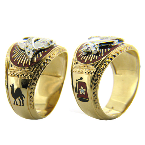 10k yellow gold Shriner ring has a solid closed back. Tapered shank features fez and camel side emblems. Red and black enamel. Item weighs approximately 12 grams. Face measures 18mm wide by 22mm. Sides taper from 12mm to 7mm at the bottom. This item is handcrafted in the USA.