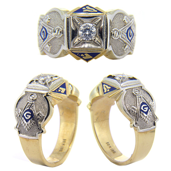 10k yellow and white gold Masonic Blue Lodge ring has a 1/2 ct round diamond. Diamond color H, clarity I1. Plumb and trowel surrounding center stone with G compass and square on both sides. Item weighs approximately 10 grams. Square face measures 8mm by 8mm. Ring measures 13mm wide at the top, tapering to 4mm wide on the bottom. This item is handcrafted in the USA. Blue enameled logos. Also available with cubic zirconia, please inquire for pricing.