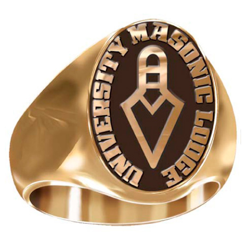 Solid back, polished 14kt yellow gold signet ring with Masonic trowel logo. Antique enamel behind the logo. Smooth tapered shank. Customize the words around the logo with up to 35 characters.