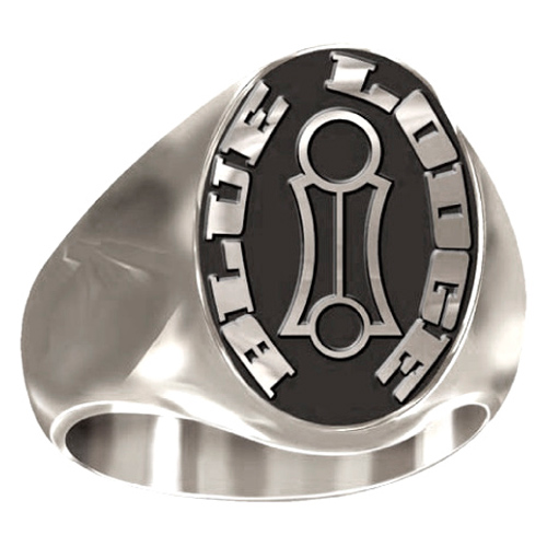 Solid back, polished 14kt white gold signet ring with Masonic plumb logo. Antique enamel behind the logo. Smooth tapered shank. Customize the words around the logo with up to 35 characters.