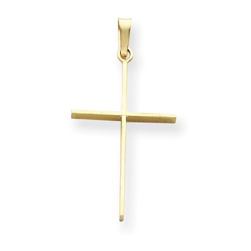 Solid 14k yellow gold stick cross pendant has very slender arms. Item measures 11/16 inch wide by 1 inch tall without loop and bail. Die struck. One of the oldest forms of the cross, the Latin cross is also the true form of the cross. Weight: 1.1 grams. Made in USA.