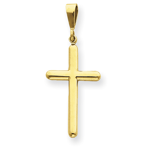 14k yellow gold cross pendant has rounded ends. Item measures 5/8 inches wide by 1 1/8 inches tall without loop and bail. Fits up to a 3mm wide chain. One of the oldest forms of the cross, the Latin cross is also the true form of the cross. Weight: 1.6 grams. Made in USA.